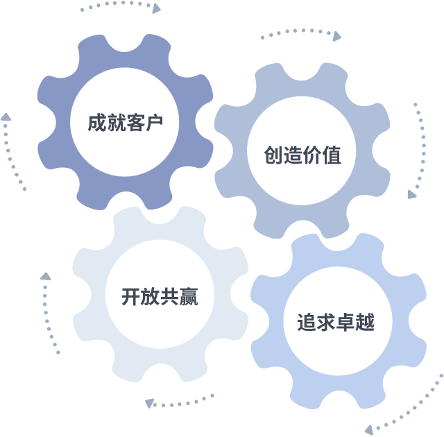 成就客户是一切决策的出发点,创造价值是衡量所有工作的标准,追求卓越是MG电子做事做人的态度,开放共赢是MG电子的格局也是最终的结果。价值观的齿轮环环相扣,推动着组织里的每个人不断向前。